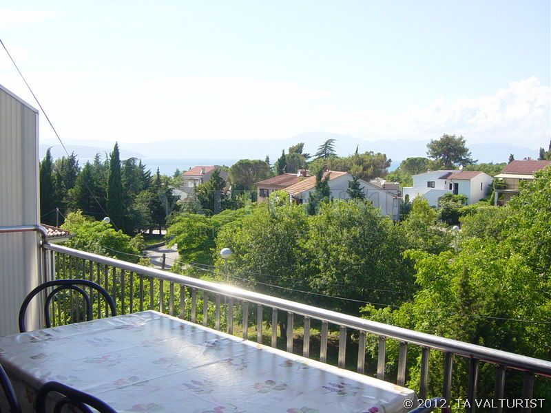 jedna prostorija za boravak, blagovaonicu i kuhinju, stol za jelo i sjedalice za sve osobe, sa balkonom, djelomičan pogled na more,