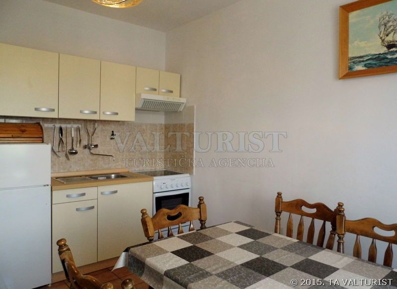 turistička kuhinja, posuđe za jelo i kuhanje, pribor za jelo i sl. nalaze se u objektu, kuhinjske krpe stoje na raspolaganju, štednjak na struju, broj kola na štednjaku: 4, pećnica, hladnjak sa ledenicom, kuhalo za vodu,
