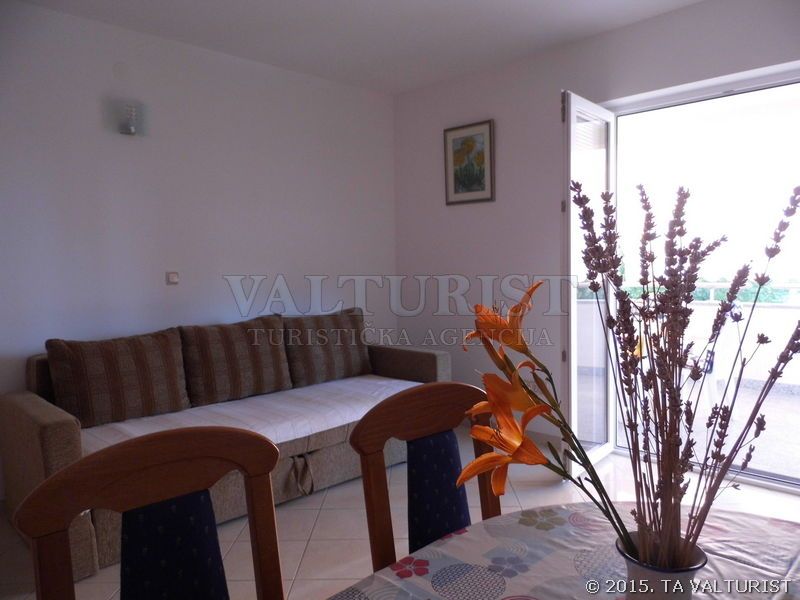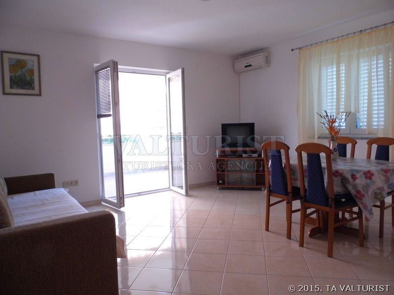 jedna prostorija za boravak, blagovaonicu i kuhinju, stol za jelo i sjedalice za sve osobe, kauč za 2 osobe, sa balkonom, pločice,