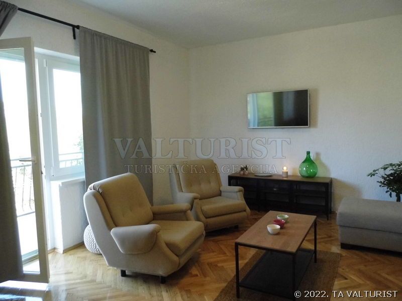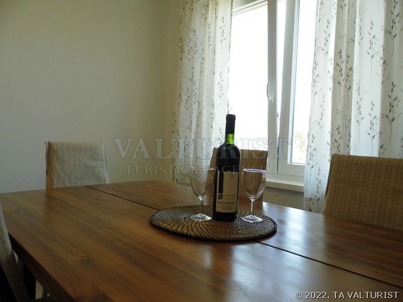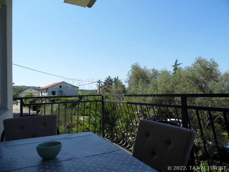 jedna prostorija za boravak, blagovaonicu i kuhinju, stol za jelo i sjedalice za sve osobe, sa balkonom, pogled na more,