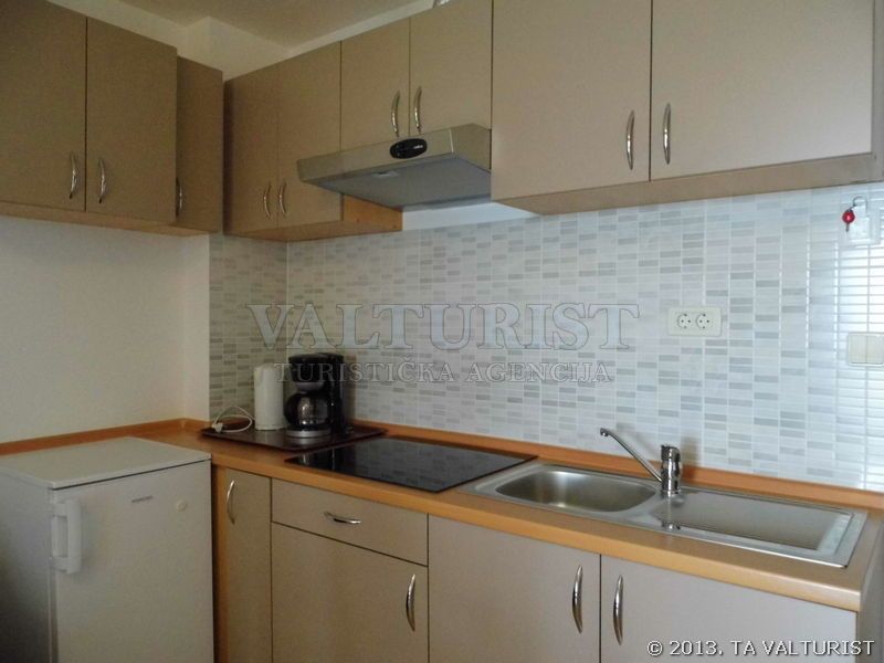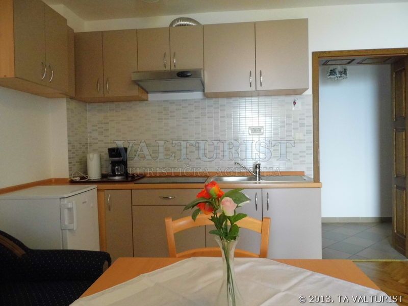turistička kuhinja, posuđe za jelo i kuhanje, pribor za jelo i sl. nalaze se u objektu, kuhinjske krpe stoje na raspolaganju, štednjak na struju, broj kola na štednjaku: 2, hladnjak sa ledenicom, filter aparat za kavu, stol za jelo i sjedalice za sve osobe,