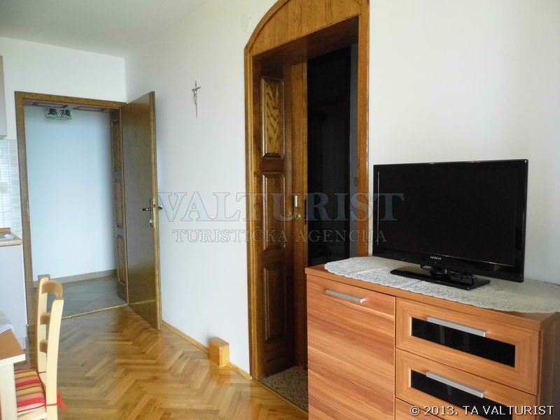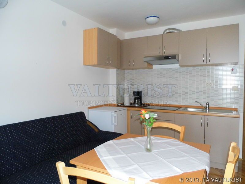 jedna prostorija za boravak, blagovaonicu i kuhinju, stol za jelo i sjedalice za sve osobe, kauč za 2 osobe, sa balkonom, pogled na more, parket,