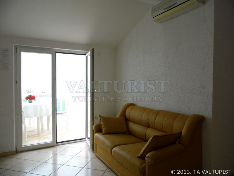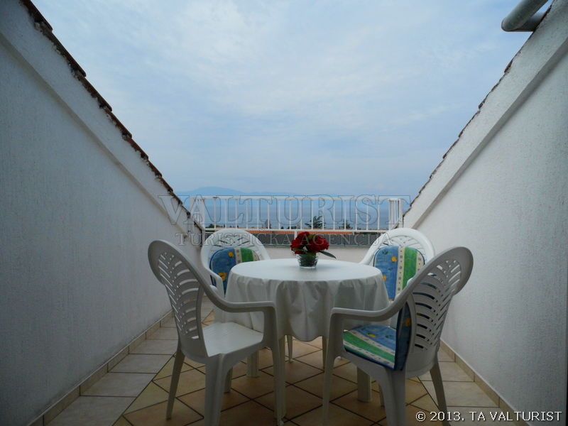 jedna prostorija za boravak, blagovaonicu i kuhinju, stol za jelo i sjedalice za sve osobe, sa balkonom, pogled na more,
