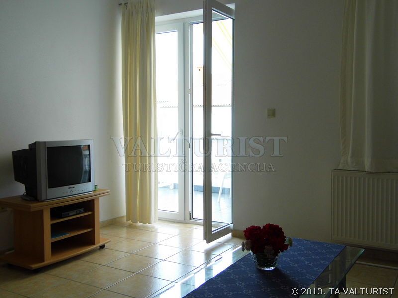 jedna prostorija za boravak, blagovaonicu i kuhinju, stol za jelo i sjedalice za sve osobe, sa balkonom, pogled na more,