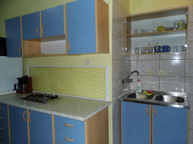 turistička kuhinja, posuđe za jelo i kuhanje, pribor za jelo i sl. nalaze se u objektu, kuhinjske krpe stoje na raspolaganju, štednjak na struju, broj kola na štednjaku: 2, hladnjak sa ledenicom, filter aparat za kavu,