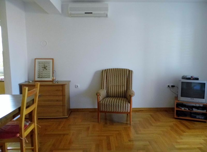 jedna prostorija za boravak, blagovaonicu i kuhinju, stol za jelo i sjedalice za sve osobe, kauč za spavanje za jednu osobu, sa balkonom,