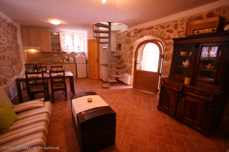 jedna prostorija za boravak, blagovaonicu i kuhinju, stol za jelo i sjedalice za sve osobe, kauč za spavanje za jednu osobu, sa terasom, pločice,