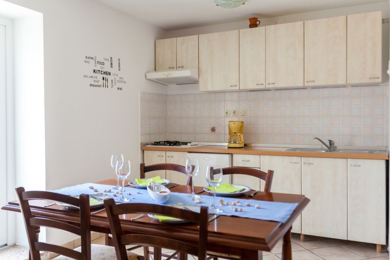 turistička kuhinja, posuđe za jelo i kuhanje, pribor za jelo i sl. nalaze se u objektu, štednjak na struju, hladnjak sa ledenicom, filter aparat za kavu, stol za jelo i sjedalice za sve osobe, sa terasom,